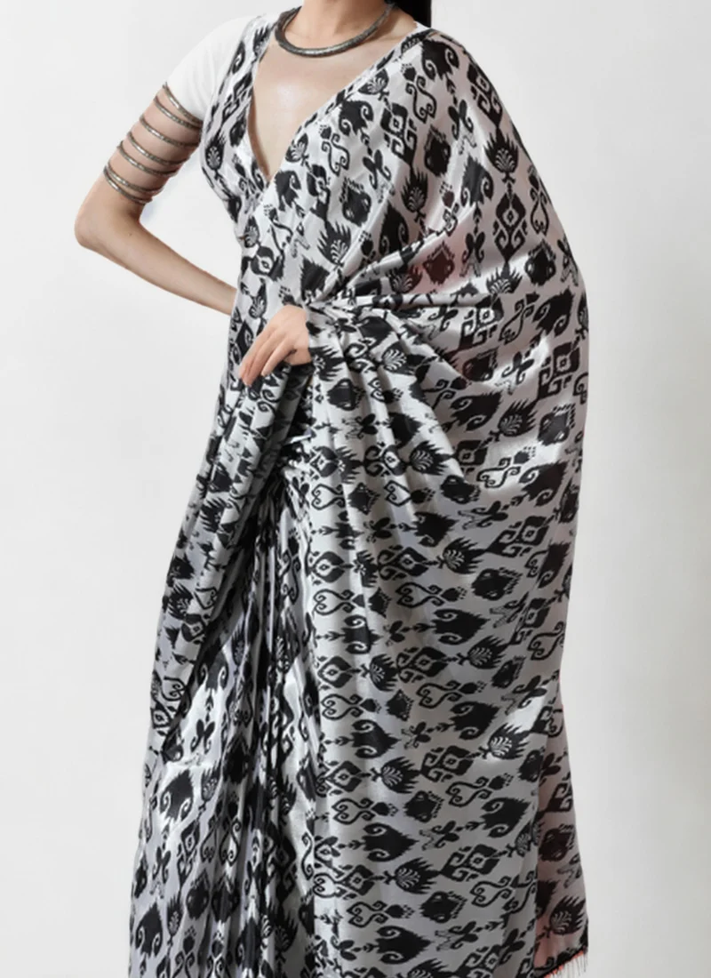 - The black and white chinon pre draped saree presents a striking contrast with its digital ikat inspired print arranged in rhythmic geometric symmetry. The abstract motifs in bold black on a soft white base create a fusion of tribal and contemporary aesthetics. The glossy finish and smooth drape of the chinon fabric add elegance and fluid movement to this visually dynamic piece.