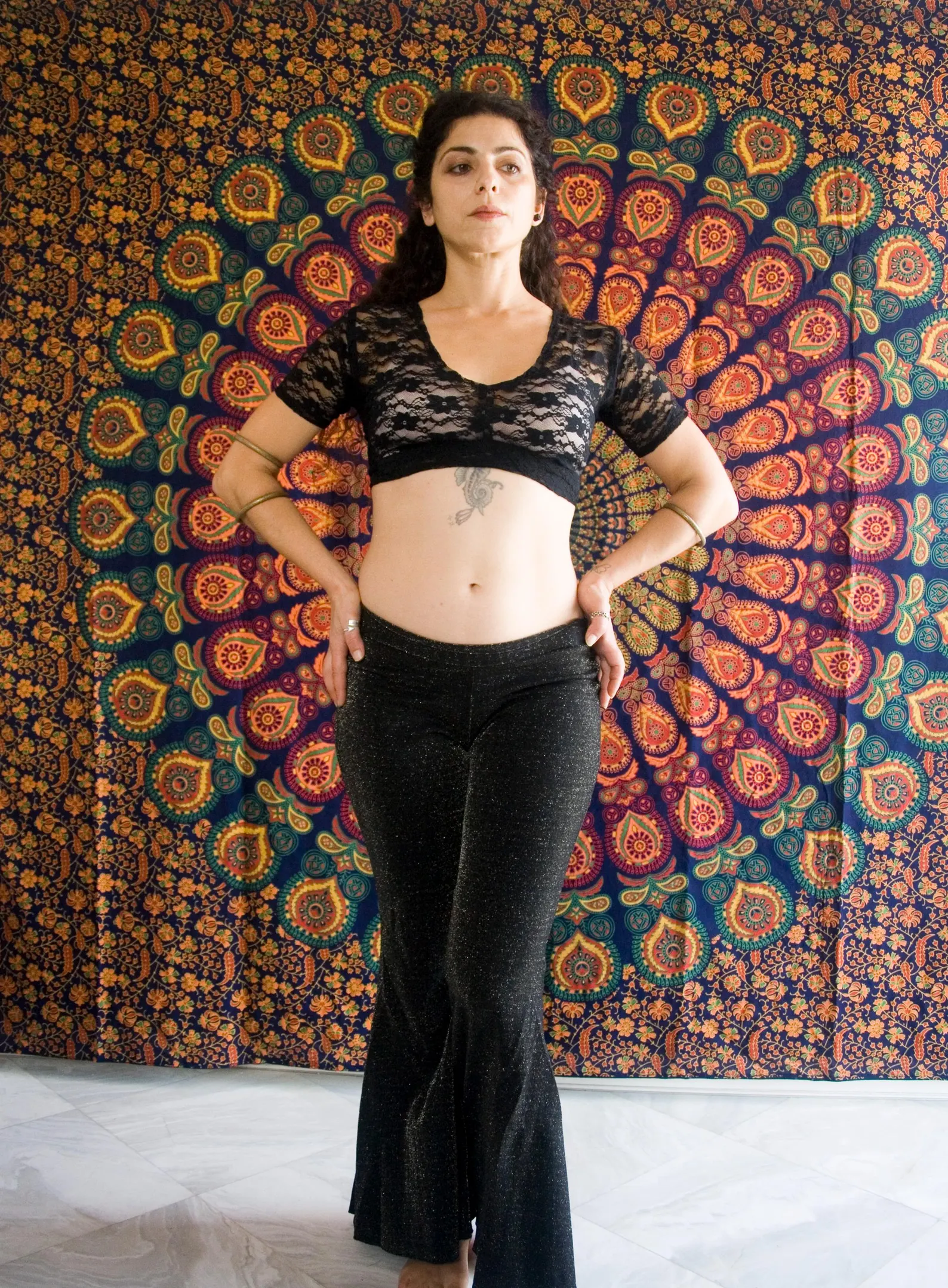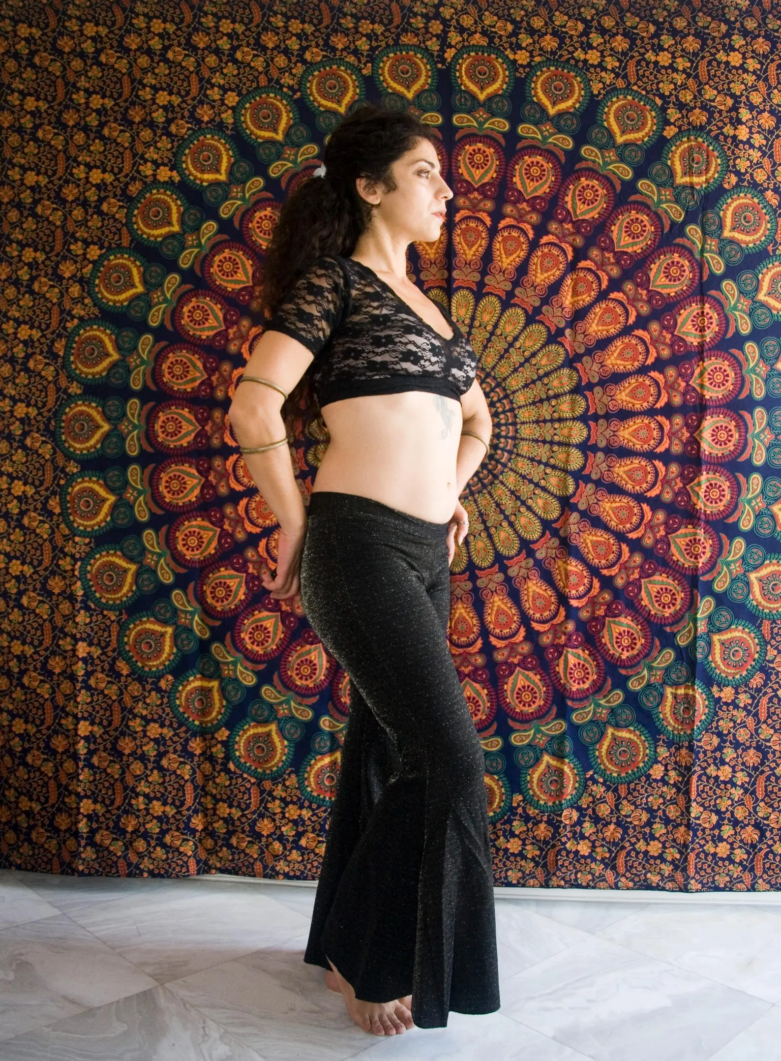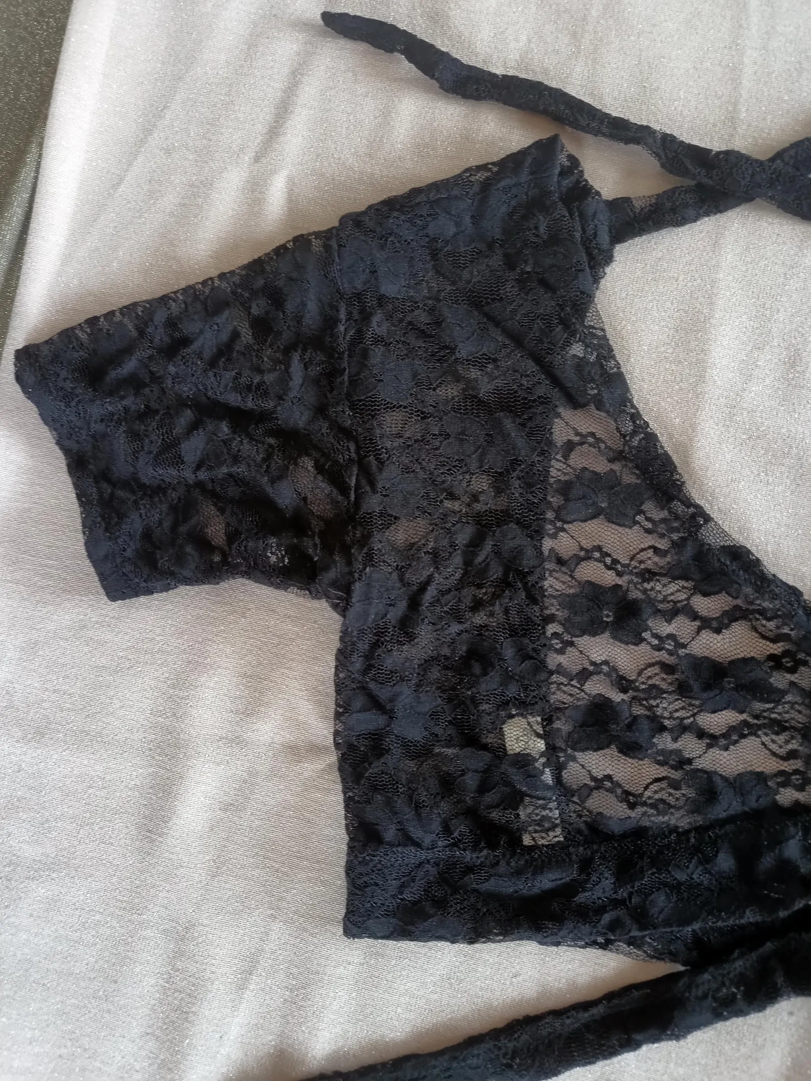 Black lace crop top with open back.