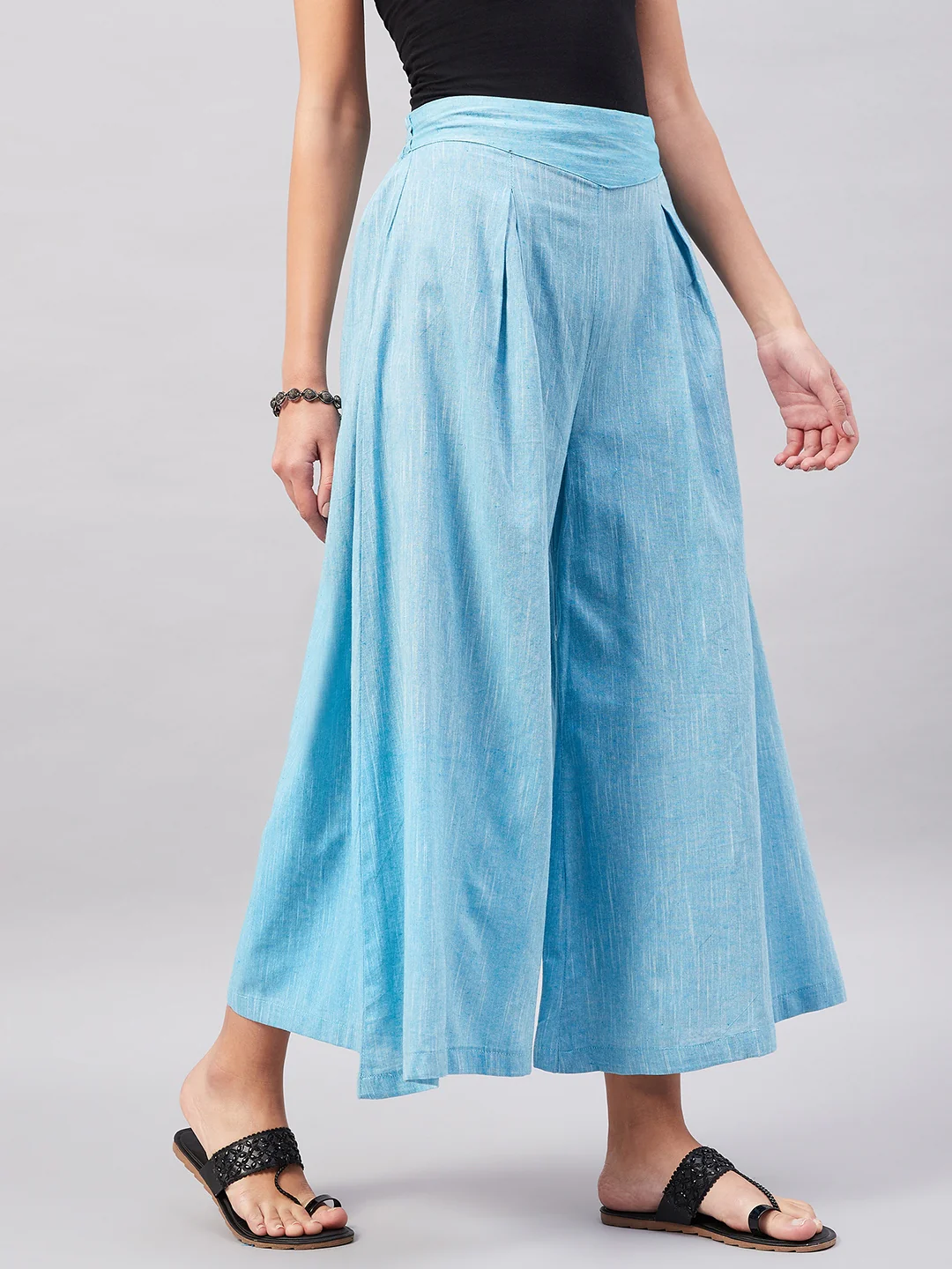 Embrace the spirit of summer with this pair of cool, gray-colored handloom palazzos. These cropped palazzos are made with original cotton fabric and showcase pretty front pleats.