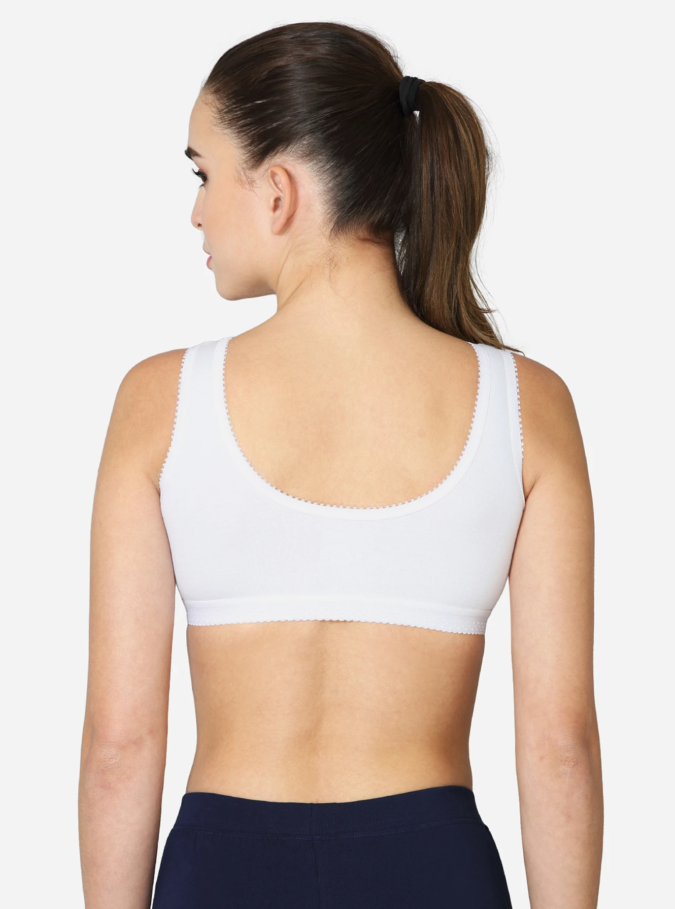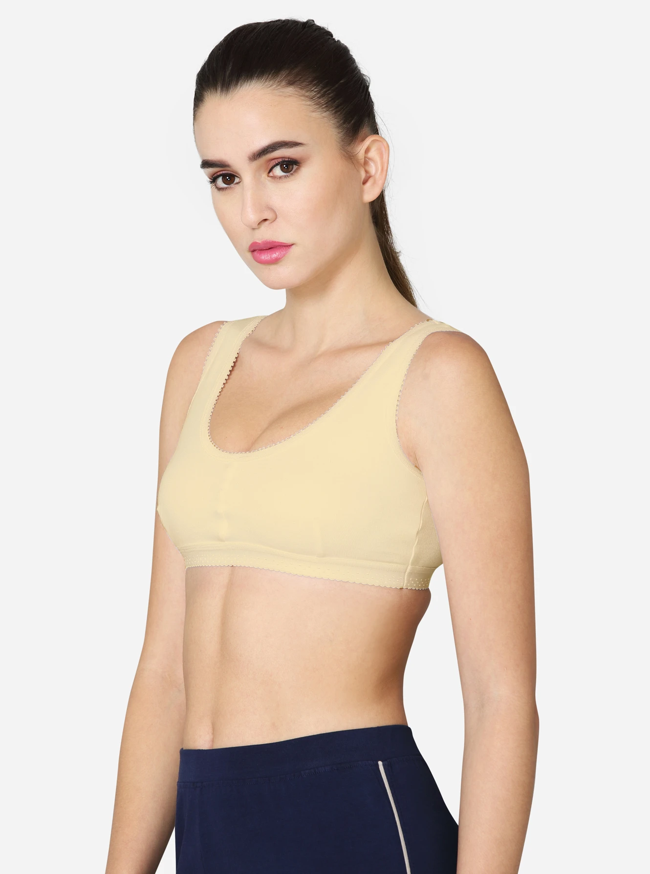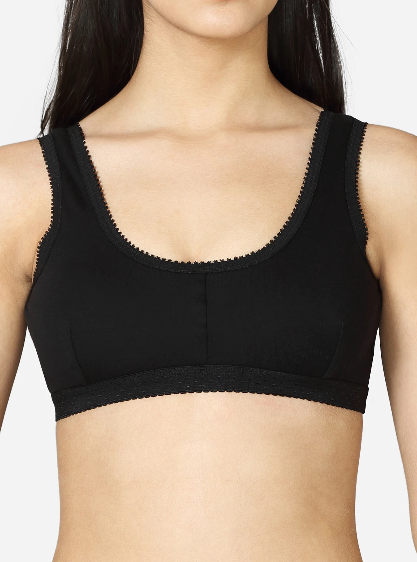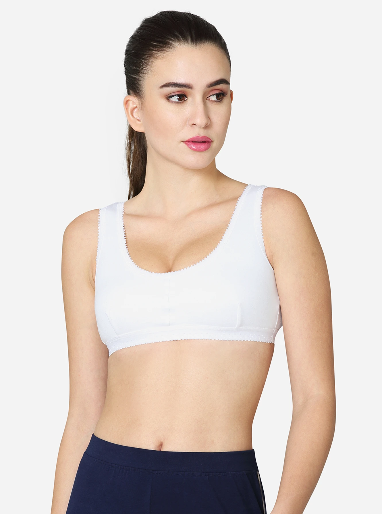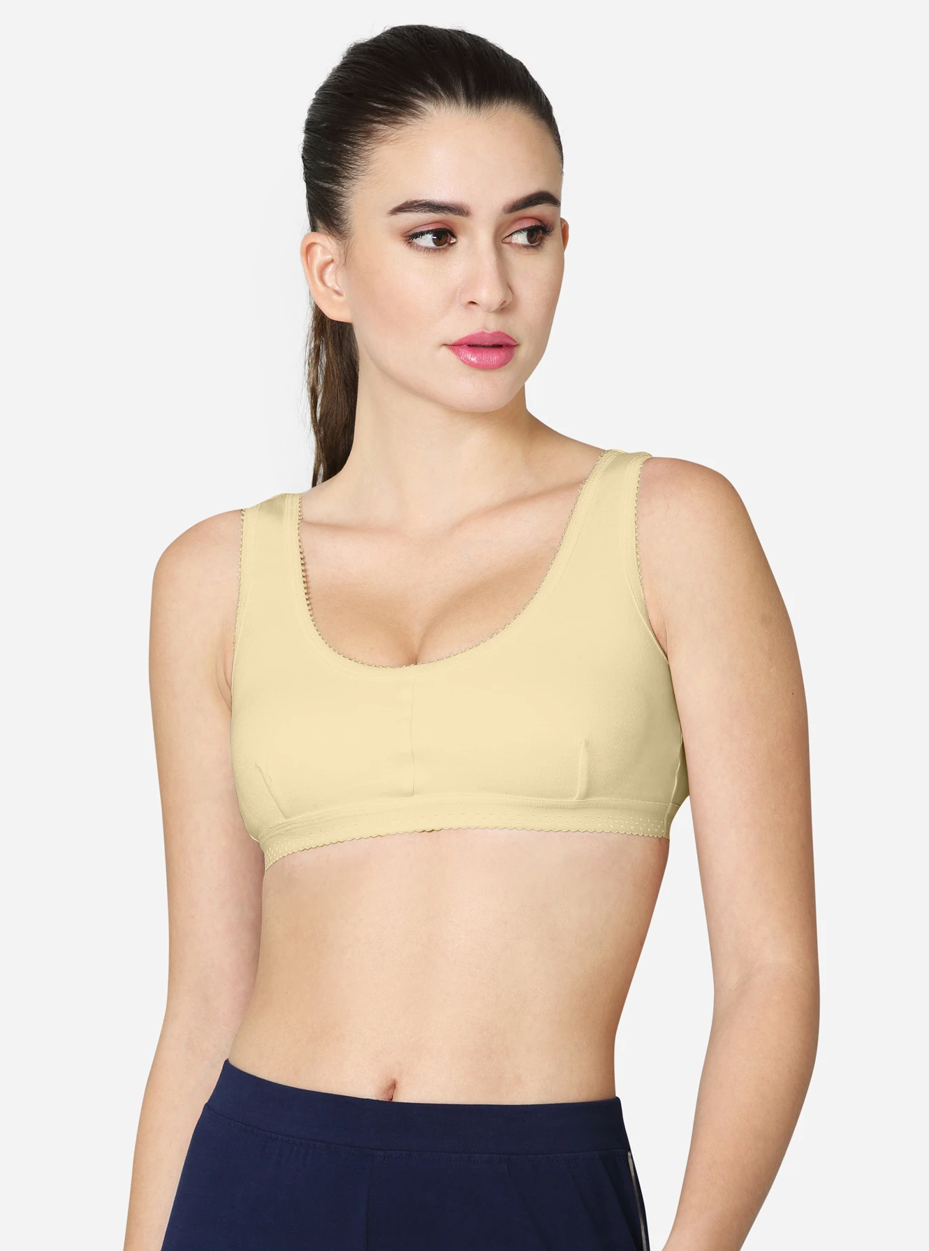 Description Made of 100% superior, soft combed cotton, providing excellent comfort. The double-layered, darted front panel provides maximum support. Seamed, non-padded with high coverage on the centre front. Soft, smooth, wide camisole-style strap.p No hooks or eyes attached for easy slip-on. Available in white skin & black colors