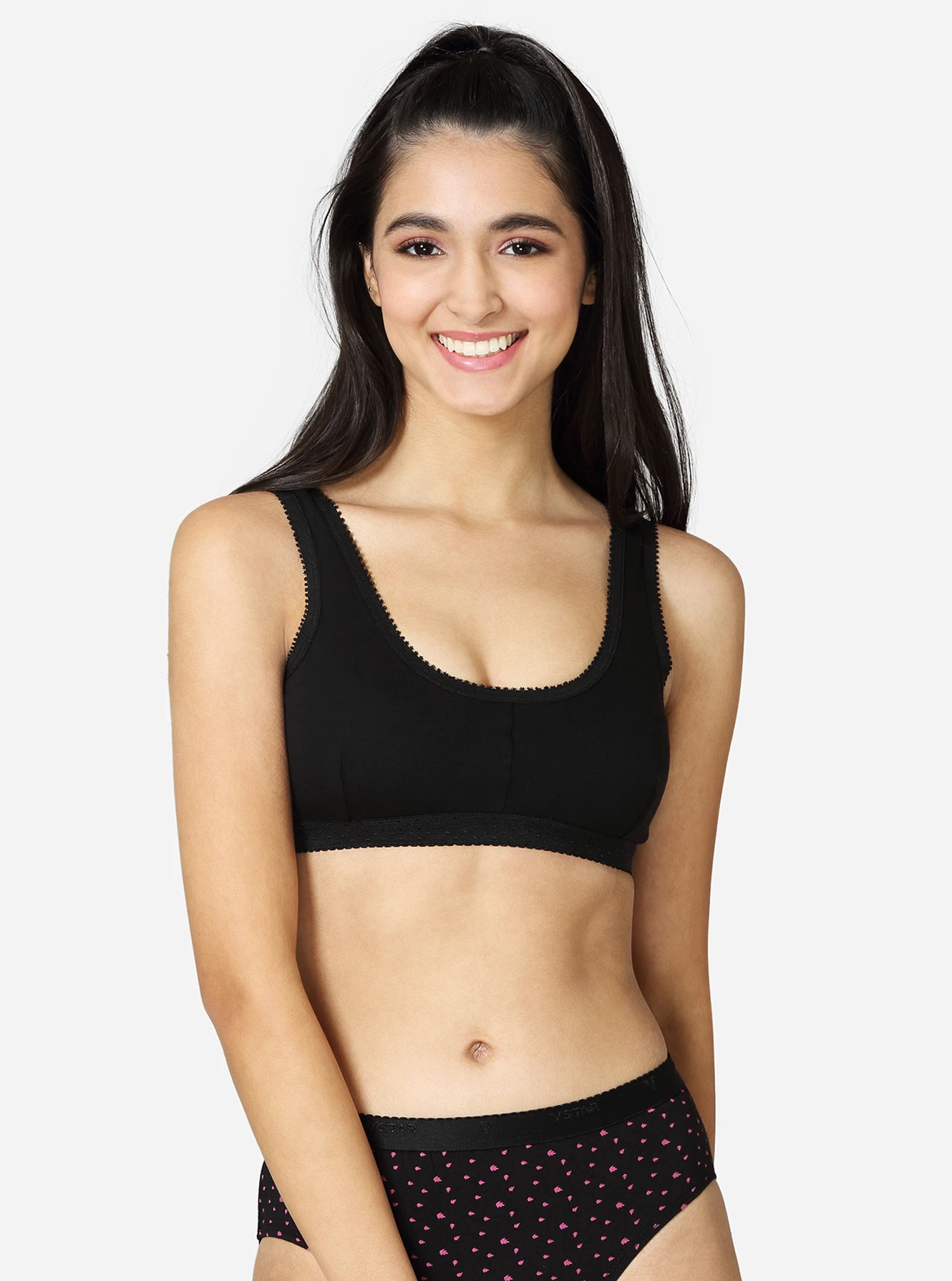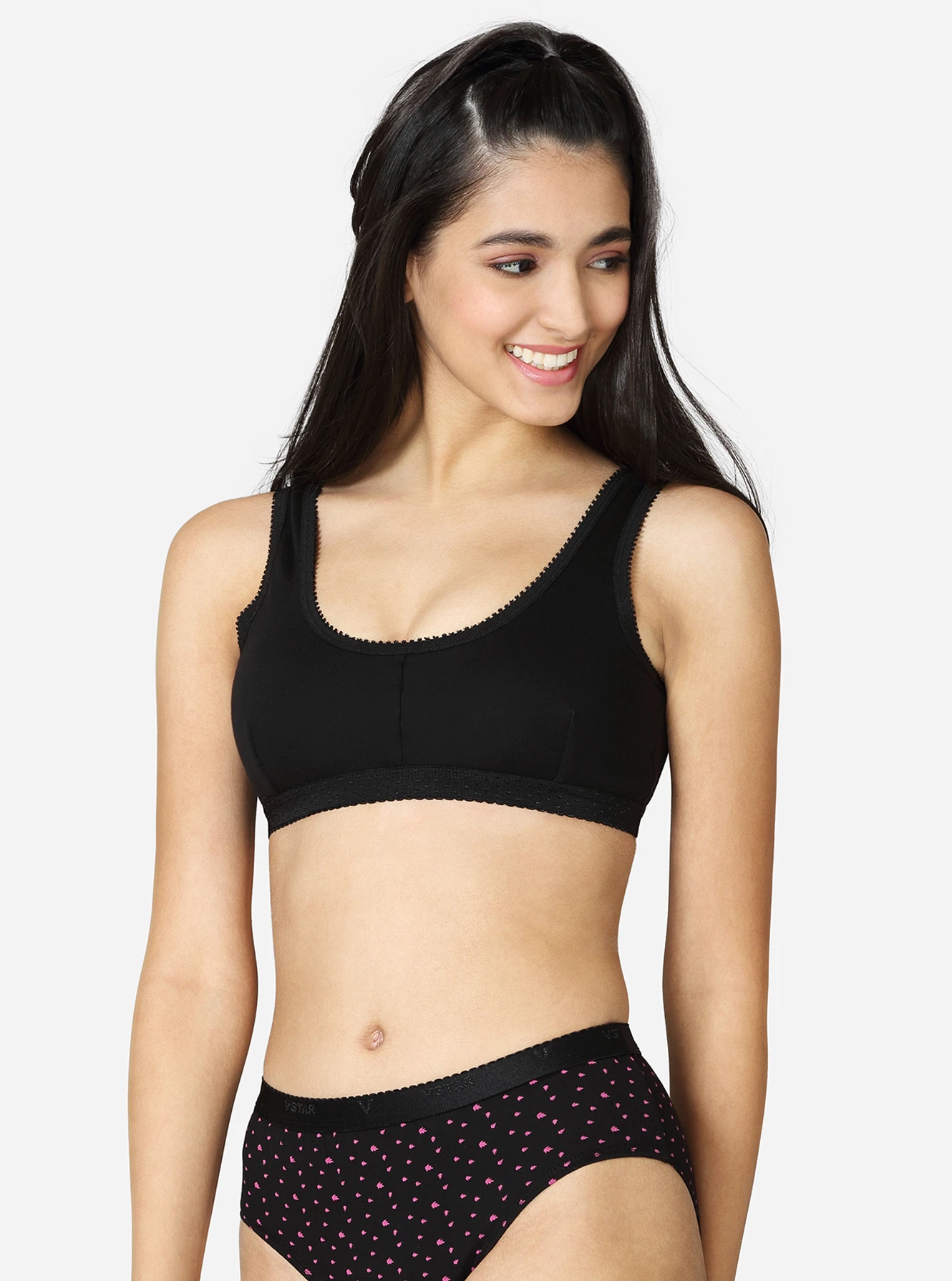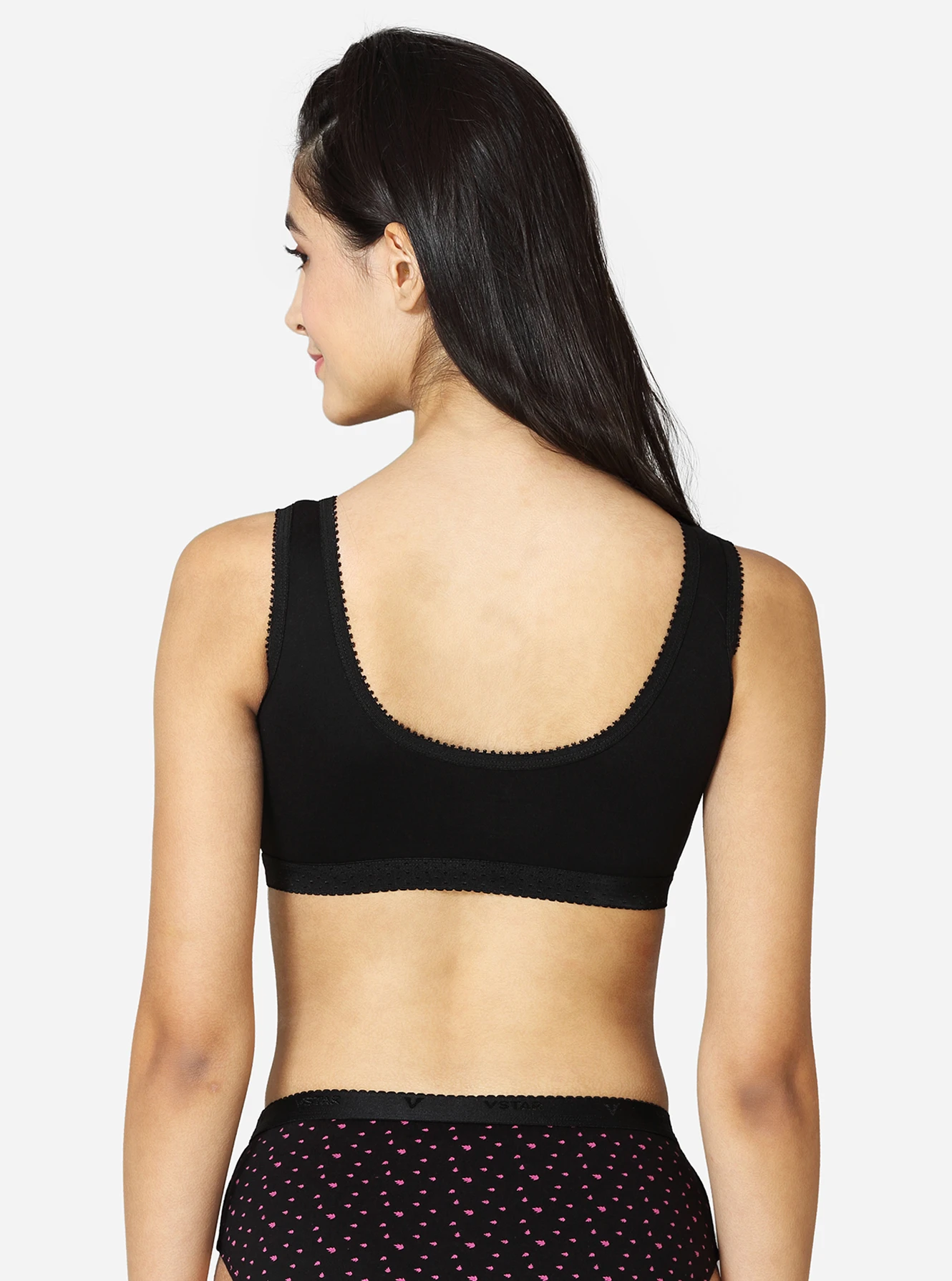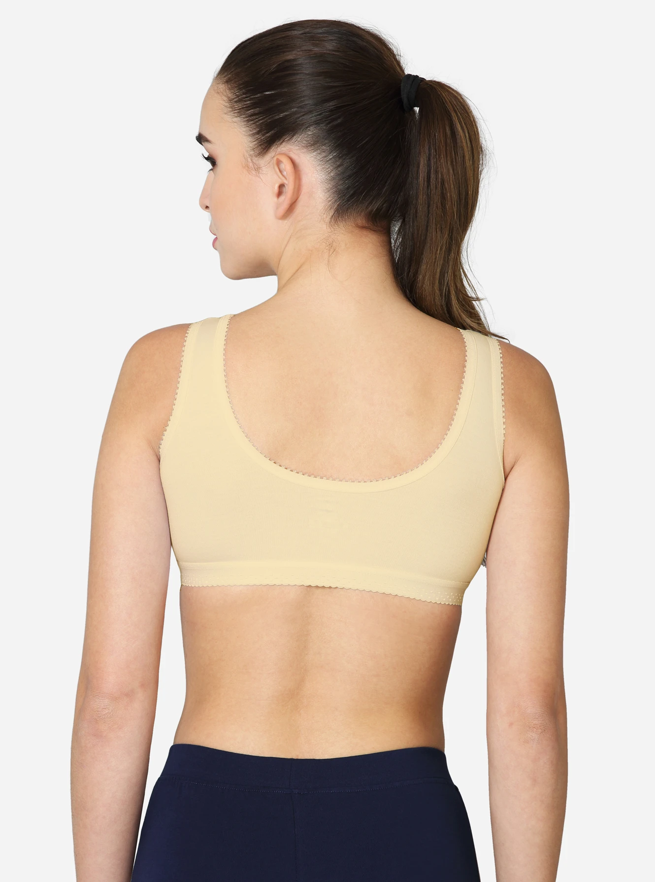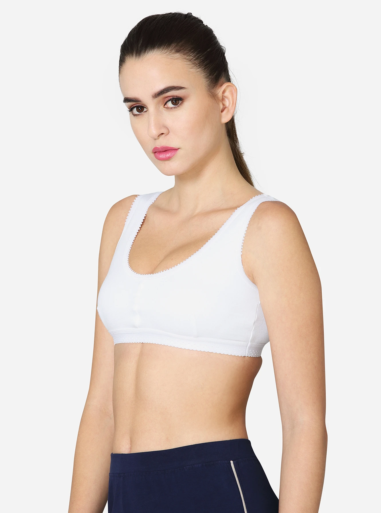 Description Made of 100% superior, soft combed cotton, providing excellent comfort. The double-layered, darted front panel provides maximum support. Seamed, non-padded with high coverage on the centre front. Soft, smooth, wide camisole-style strap.p No hooks or eyes attached for easy slip-on. Available in white skin & black colors