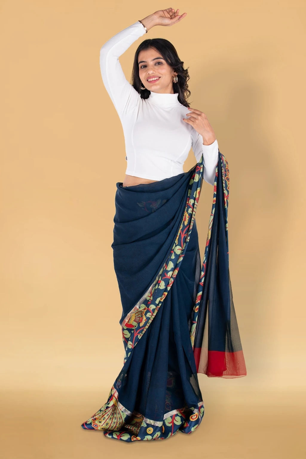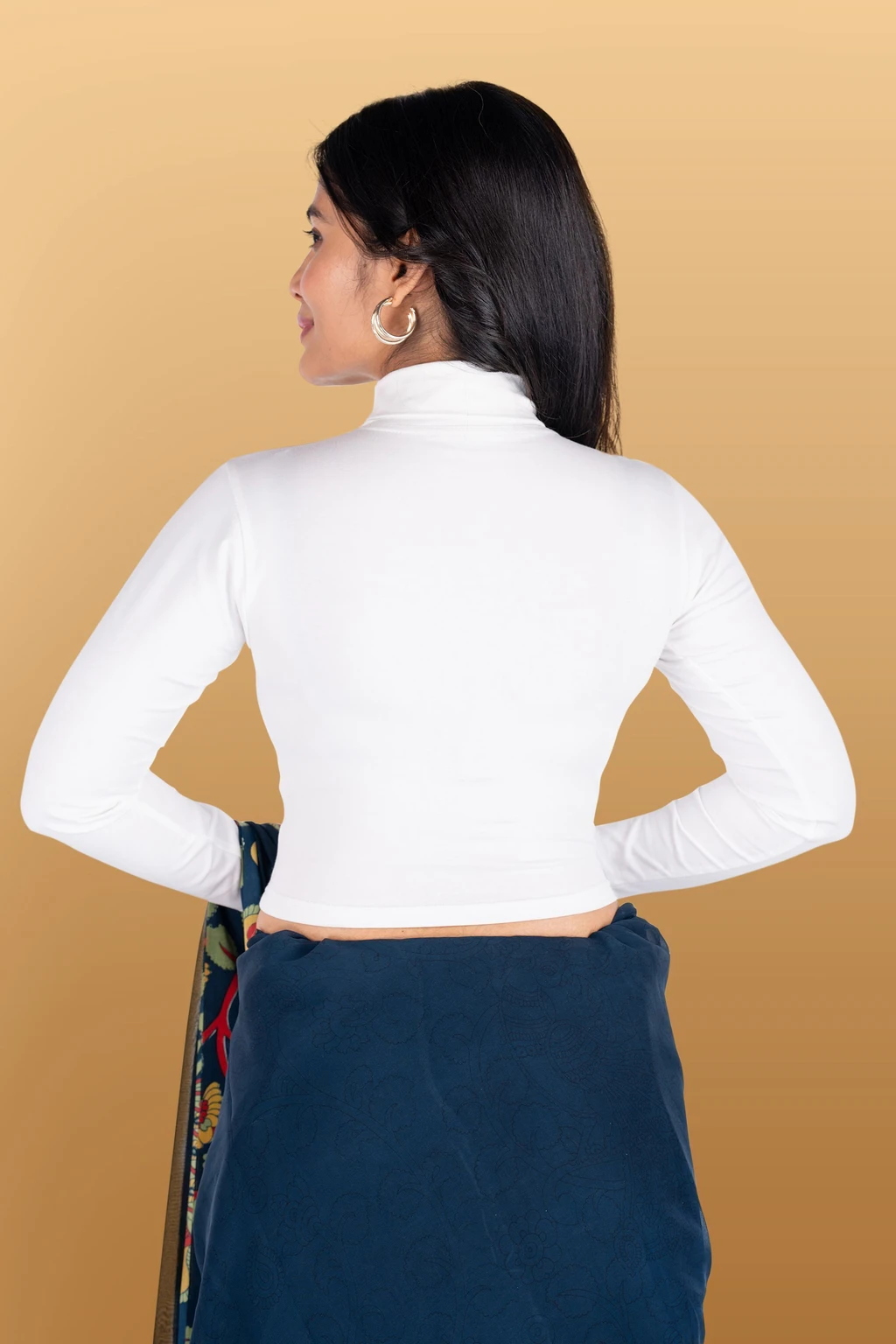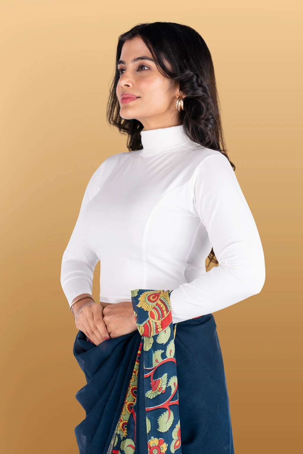 Elevate your ethnic style with this elegant high-neck cropped blouse, designed to pair perfectly with sarees, lehengas, and skirts. Crafted from soft, stretchable fabric, this blouse offersa snug yet comfortable fit that enhances your silhouette. The full sleeves and modern high neckline add a contemporary touch while maintaining a classy ethnic appeal. Ideal for festive occasions, parties, office wear, and casual ethnicstyling, this versatile blouse is a must-have wardrobe essential. The smooth finish and rich, solid color make it easyto mix and match with printed or plain sarees. Note: Sareeshown in images is for styling purposes only and is not included.