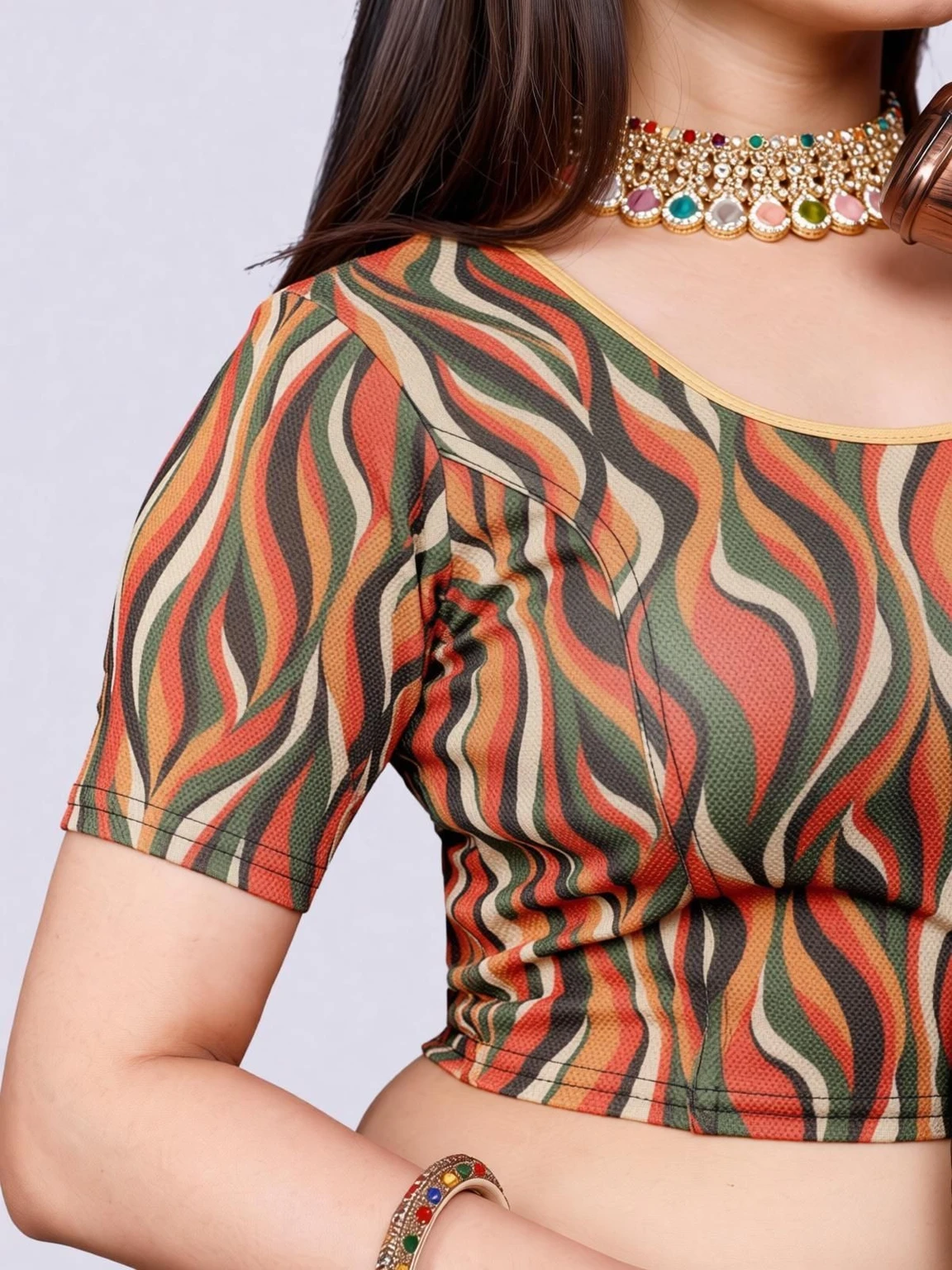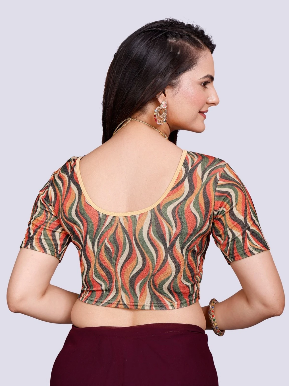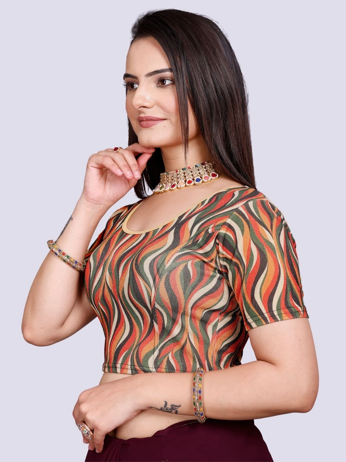 Elevate your wardrobe with this chic blouse crafted from stretchable Lycra fabric. The round neck design offers a classic and flattering silhouette, while the half sleeves provide a touch of elegance and versatility. The Lycra material ensures a comfortable, form-fitting shape that moves withyou, making it perfect for both casual and formal occasions. Embrace style and comfort with this must-have addition to your collection.
