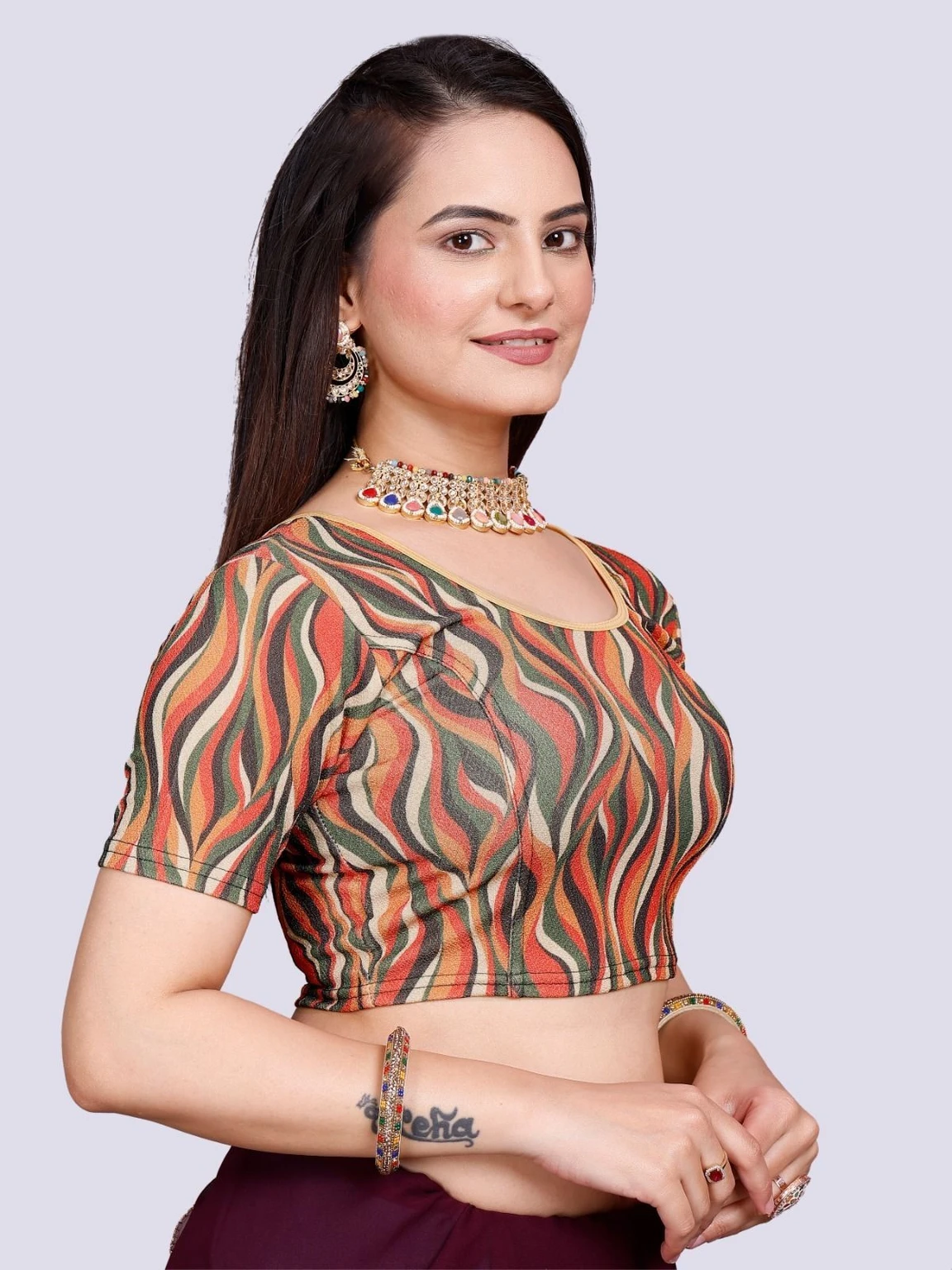 Elevate your wardrobe with this chic blouse crafted from stretchable Lycra fabric. The round neck design offers a classic and flattering silhouette, while the half sleeves provide a touch of elegance and versatility. The Lycra material ensures a comfortable, form-fitting shape that moves withyou, making it perfect for both casual and formal occasions. Embrace style…