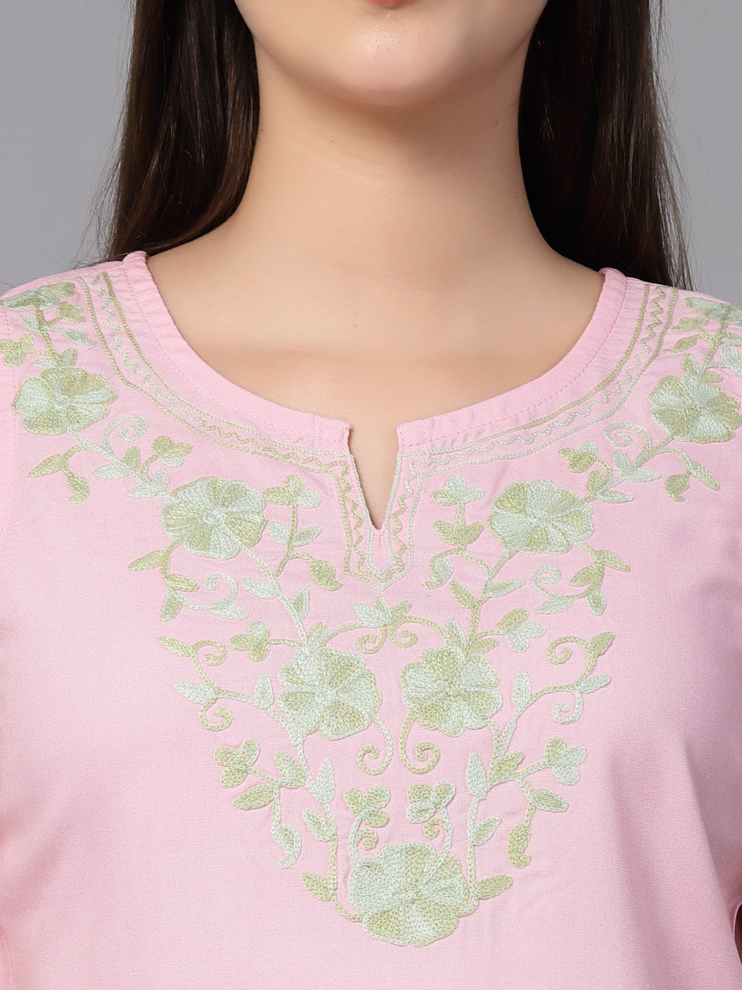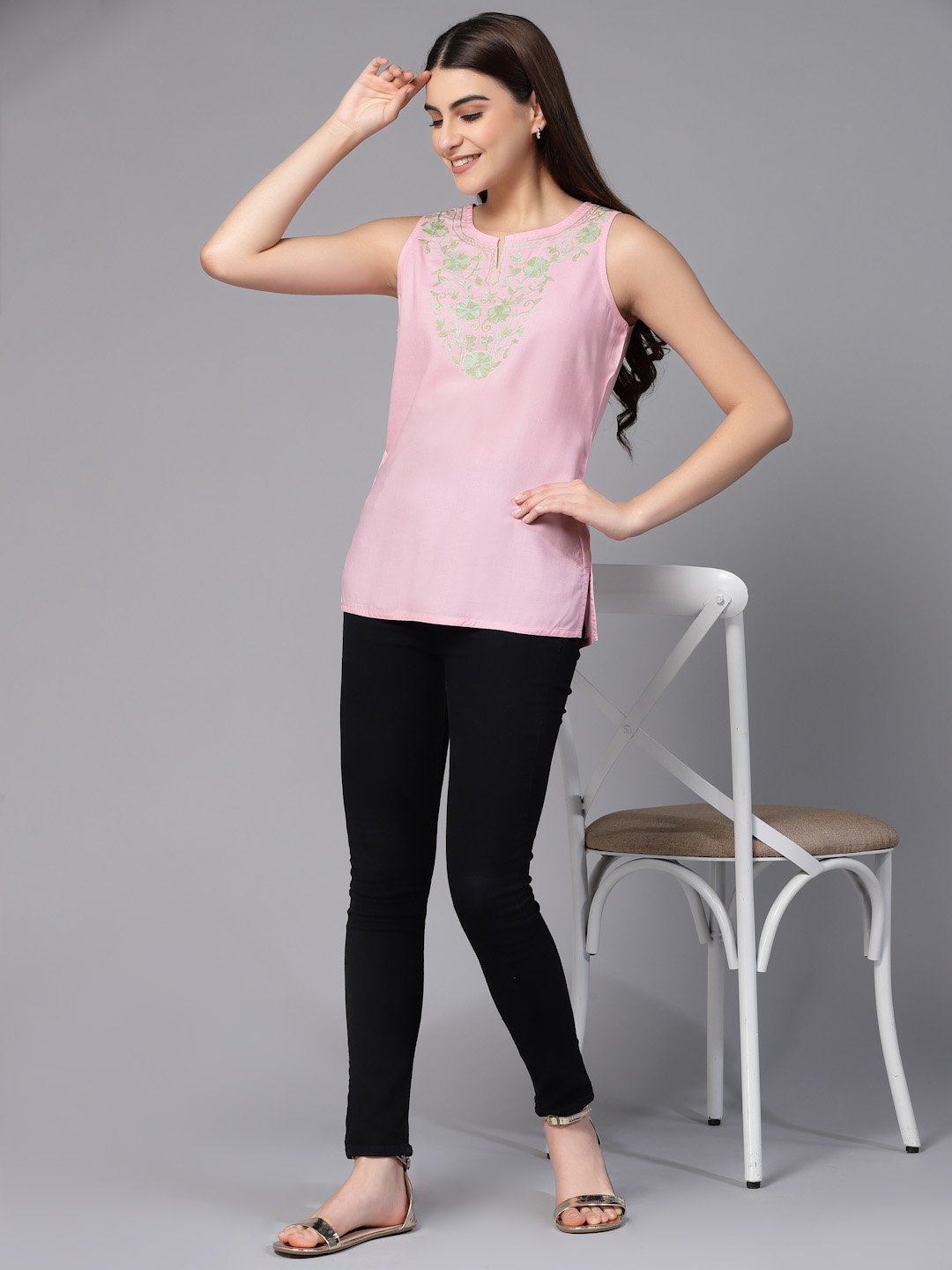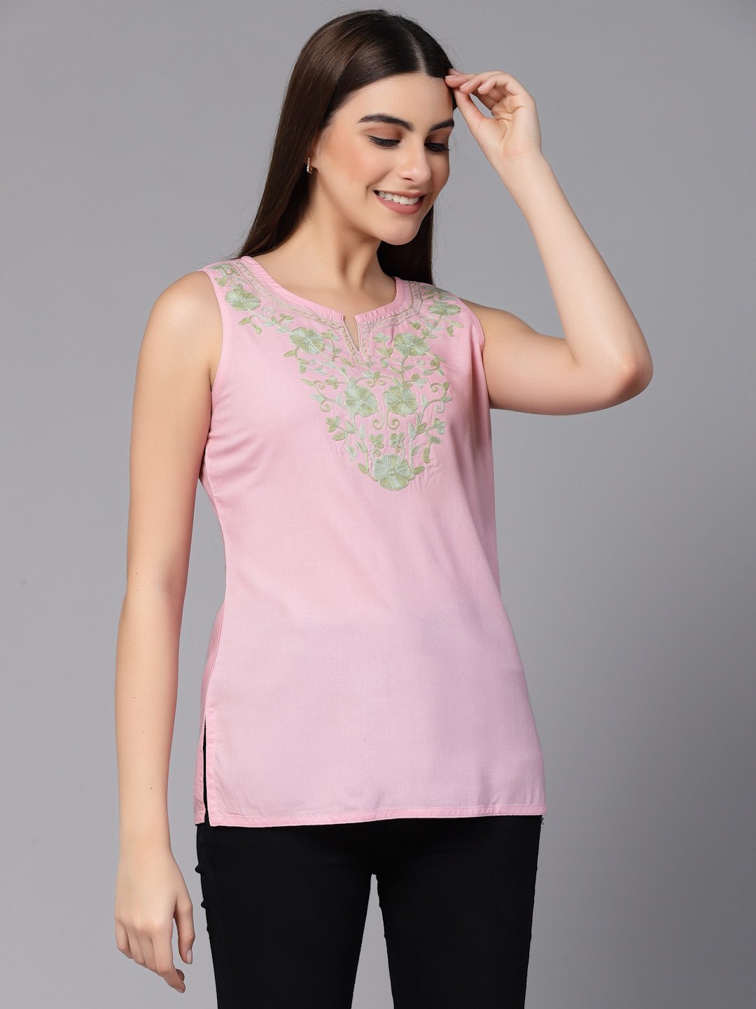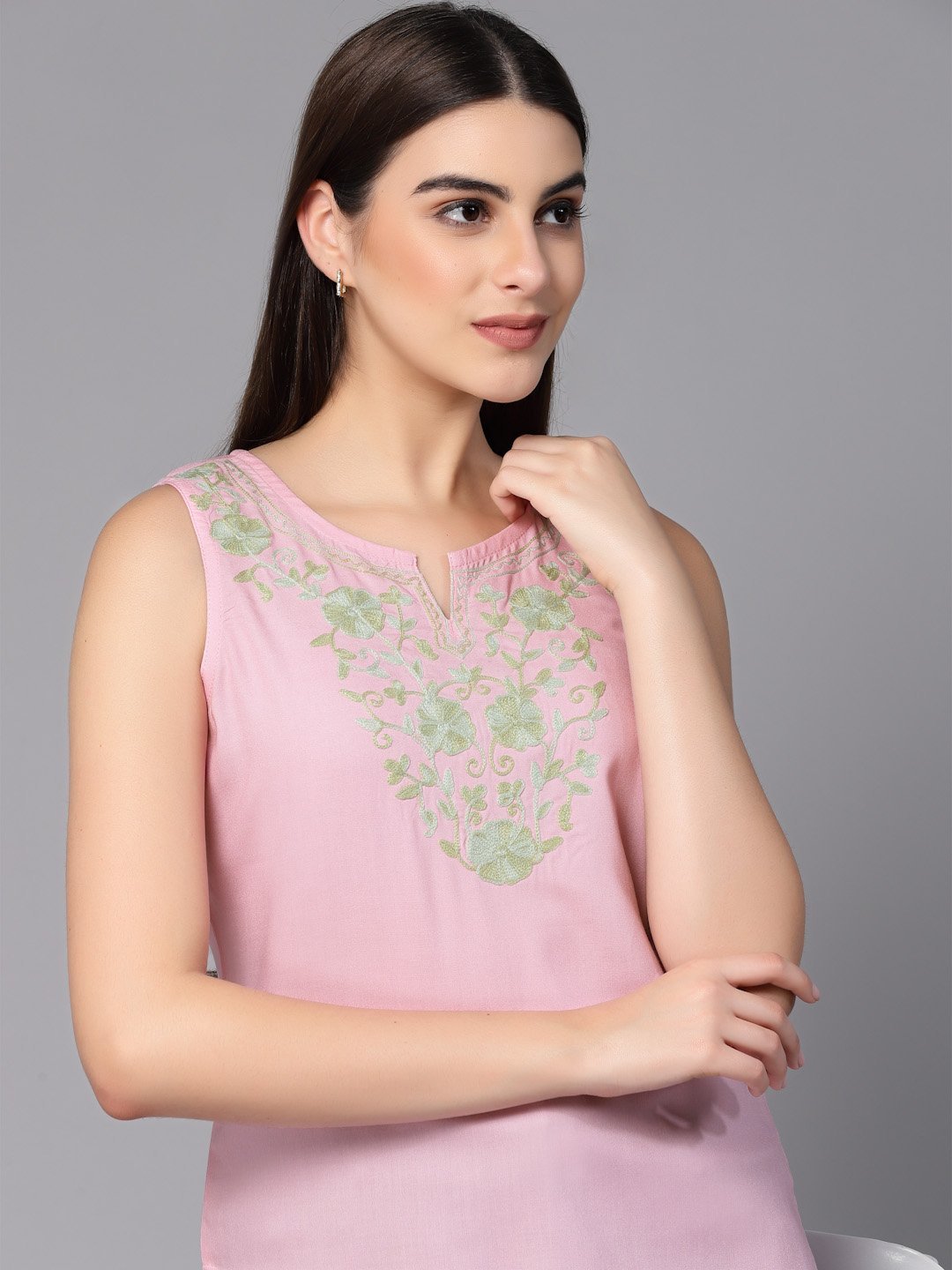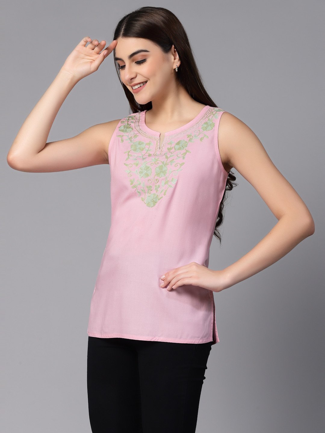 Colour: Light Pink Sleeves: Sleeveless Shape: Straight Fabric: Rayon Cotton Washcare: Gentle Hand wash, Use mild detergent Colour Declaration: There might be slight variation in the actual color of the product due to different screen resolutions Embroidery: Kashmiri Aari Using Cotton Thread Kurti Length: 25 Inches | Easy to Pair: Looks great with leggings, jeggings,…