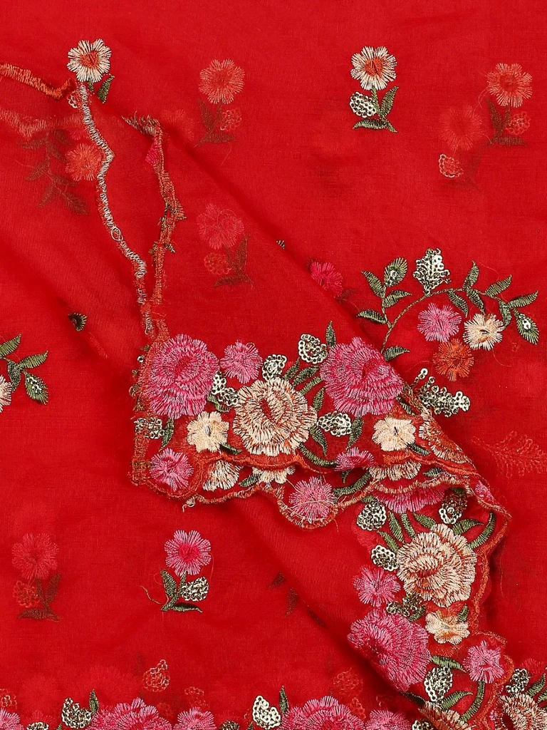 - This light weight organza dupatta is adorned with colourful embroidery all over along with scalloped borders .