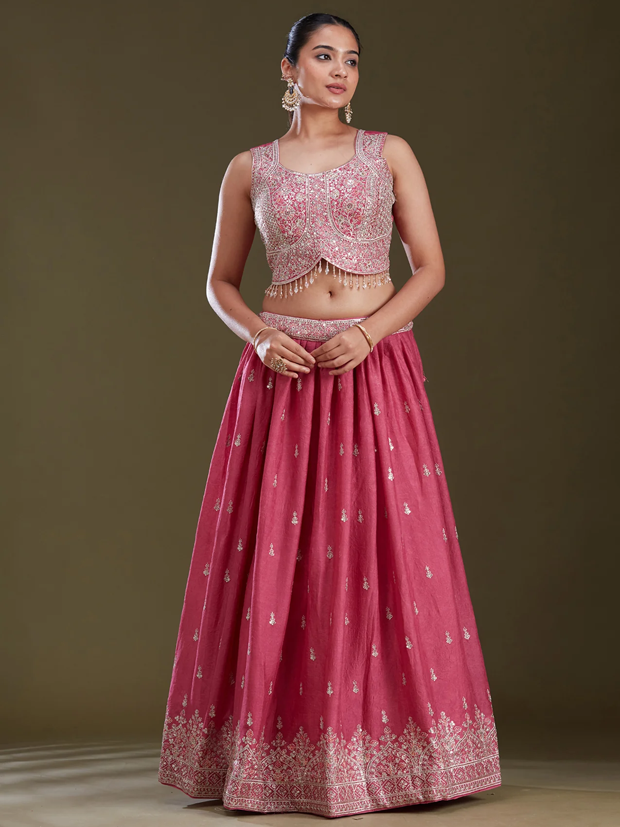 Readymade Lehenga in Soft Raw Silk fabric. The Lehenga is embellished with Zariwork (Silver) embroidery. Accompanied with an Readymade blouse and dupatta. Comes with the Koskii promise of premium quality.