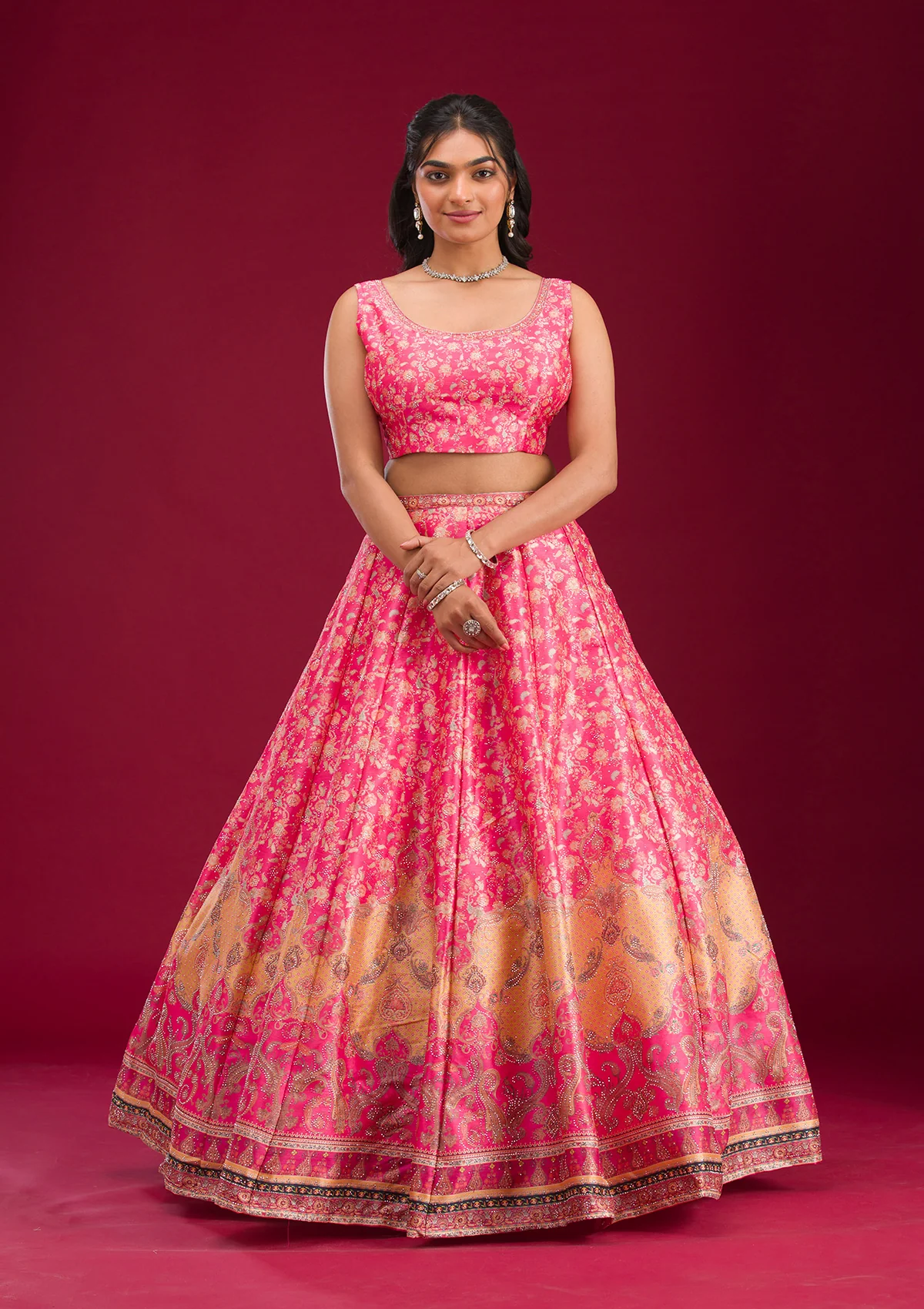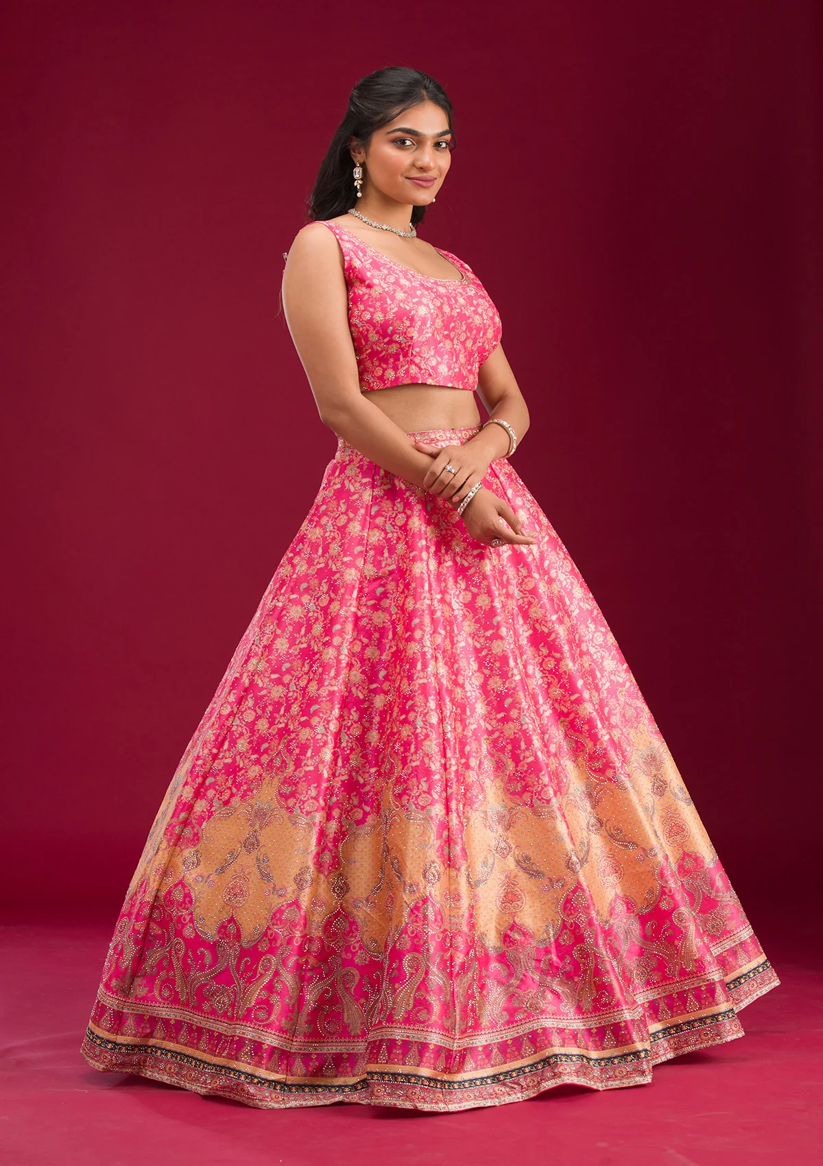 Twirl and dazzle at any grand affair in this Raw Silk Magenta Lehenga, exquisitely embroidered with genuine Swarovski crystals that capture every shimmer of light. Designed to epitomize luxury, this lehenga promises not just comfort but also a spectacular display of vibrant magenta hues and intricate craftsmanship. Perfect for the bride who loves to blend tradition with a touch of modern opulence!.