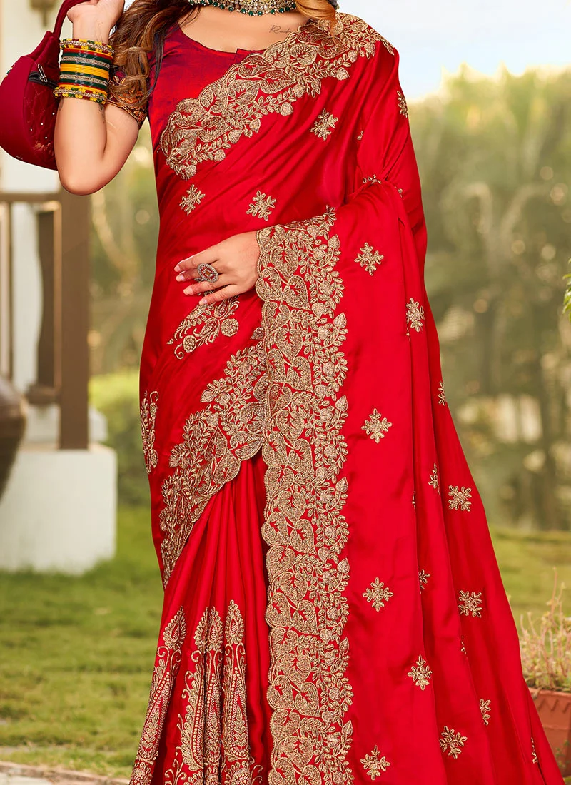 The Red Satin Blend Embroidered Saree is a stunning piece of ethnic attire that embodies elegance tradition and modern fashion sensibilities. Crafted with meticulous attention to detail this saree is a perfect blend of timeless grace and contemporary style. The rich red hue of the satin fabric exudes sophistication and warmth making it an ideal choice for special occasions such as weddings parties and festivals. The soft and smooth texture of the satin blend fabric drapes beautifully enhancing the wearers silhouette and adding a touch of glamour to any event. One of the standout features of this saree is its intricate embroidery work. Delicate and elaborate embroidery adorns the saree creating exquisite patterns and motifs that catch the eye. The embroidery is done with precision and skill using fine threads and embellishments that add a touch of opulence to the overall design. The craftsmanship reflects the expertise of skilled artisans who have poured their creativity and dedication into every stitch making this saree a true work of art. The saree is adorned with tasteful embellishments that enhance its overall appeal. Shimmering sequins dazzling stones and intricate zari work are meticulously incorporated into the design adding a subtle sparkle that catches the light and creates a mesmerizing effect. These embellishments not only elevate the aesthetic appeal of the saree but also make it perfect for evening events and celebrations. The pallu of the saree is particularly noteworthy featuring elaborate embroidery and a border that frames the drape beautifully. The attention to detail in the pallu design showcases the craftsmanship of the artisans and adds a touch of grandeur to the ensemble. The saree comes with a matching blouse piece that complements the overall look allowing the wearer to customize the blouse according to their preferences. In summary the Red Satin Blend Embroidered Saree is a masterpiece that combines luxurious fabric exquisite embroidery and tasteful embellishments to create a saree that is both visually stunning and culturally rich. It is a testament to the rich heritage of Indian craftsmanship and a musthave addition to any discerning fashion enthusiasts wardrobe. Wearing this saree is not just a fashion choice it is a celebration of artistry culture and individuality.