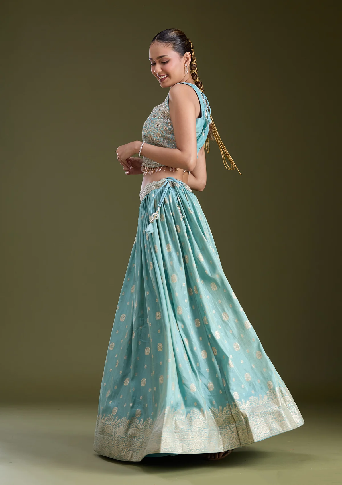 Sky Blue and Lavender Readymade Lehenga in Banarasi fabric. The Lehenga is embellished with sequin embroidery. Accompanied by a Readymade blouse and dupatta. Comes with the Koskii promise of premium quality.