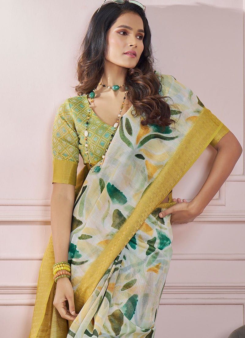 - The saree comes paired with a Mustard Soft Silk Printed Zari Woven Blouse designed to complement the sarees elegance. The blouse can be customized to your preferred style whether its a classic round neck a bold Vneck or even a chic sleeveless design. This customization option allows you to tailor the outfit to suit your personality and the occasion.