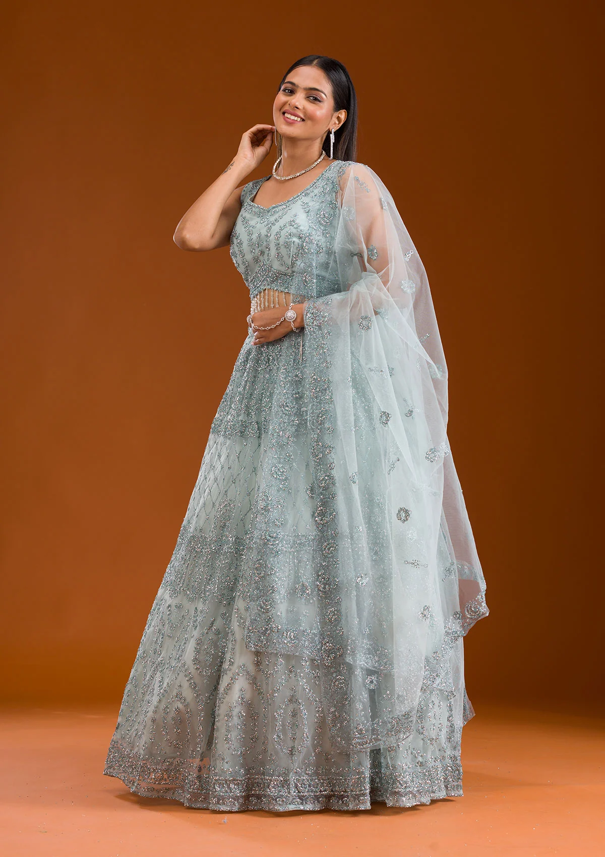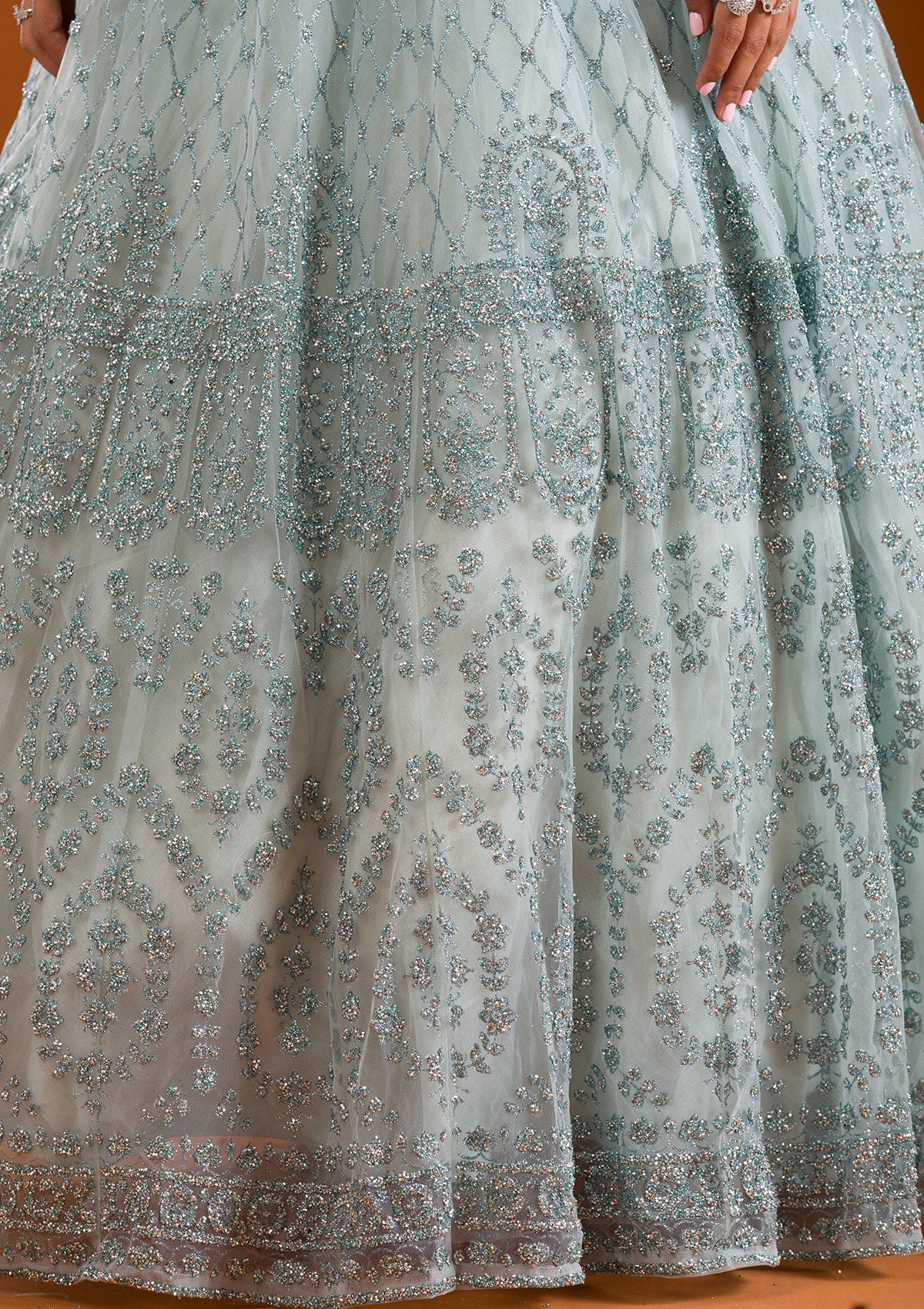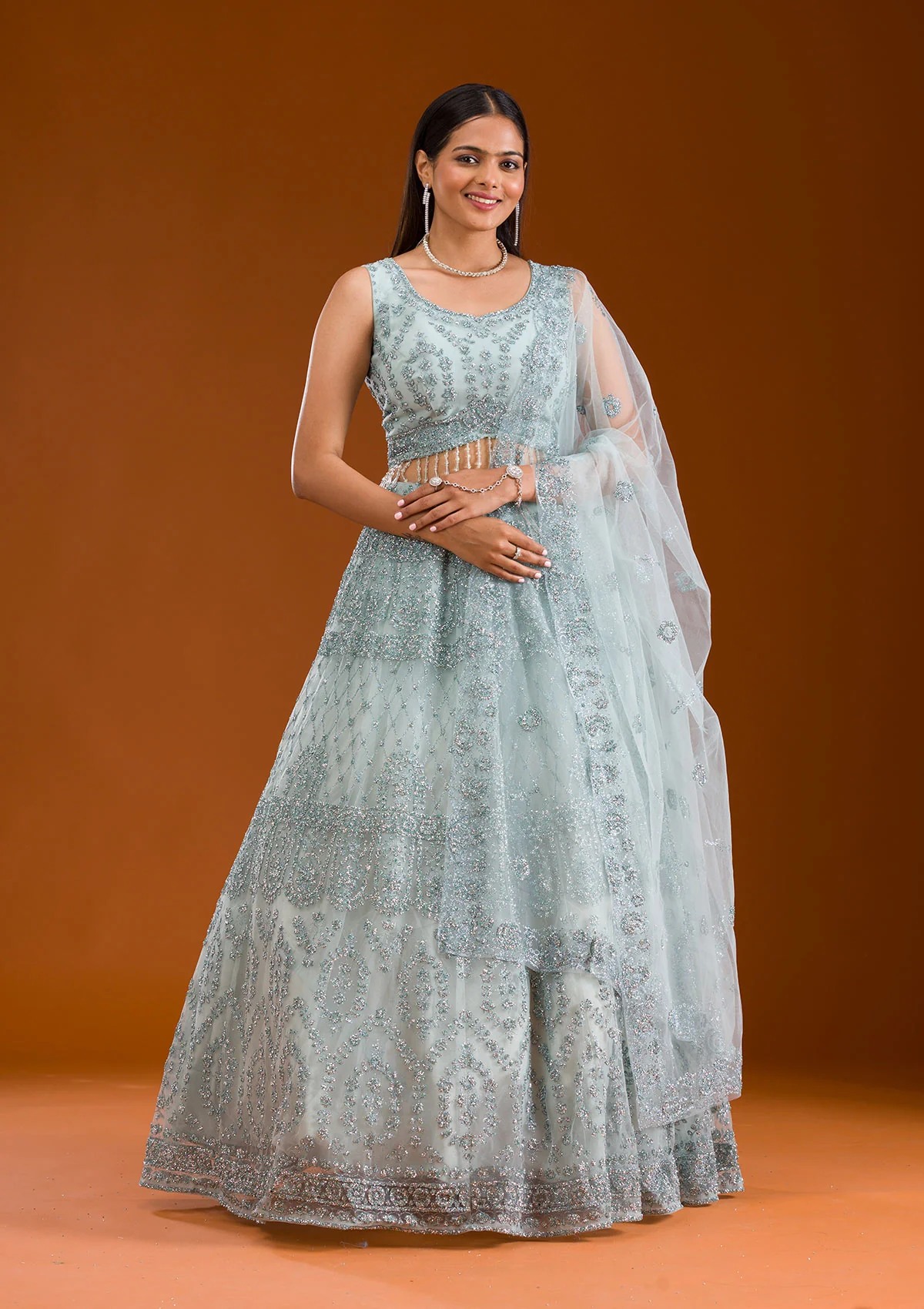 Unleash your vibrant side with mint green lehenga, a masterpiece in net fabric adorned with meticulous stonework. This lehenga blends the freshness of mint with the sparkle of delicately placed stones, creating a spectacle of light and fabric. It’s not just attire, it’s a statement—where traditional craftsmanship meets contemporary charm in an ensemble that’s as alive and effervescent as you are!.