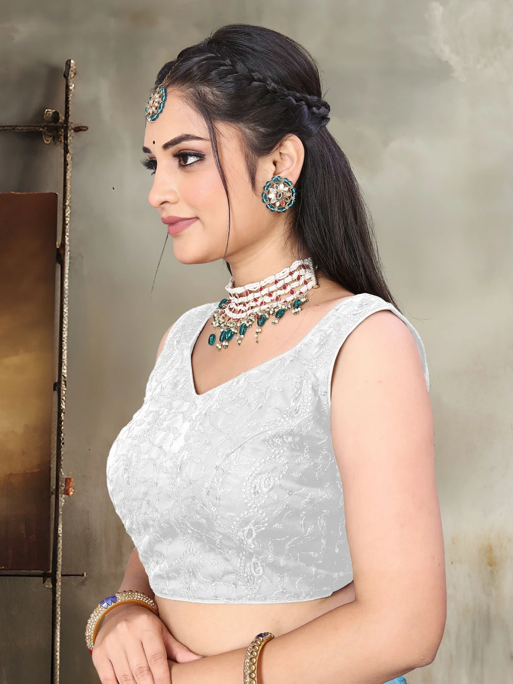 Georgette sleeveless embroidered readymade blouse. Madefrom premium quality fabric. This blouse is extremely comfortable and a great choice for any season or festive season. This blouse has high-quality fabric; you can wear itwith a solid coloured saree. Sizes are from -30 to 36, if thesize seems a little smaller, then you can get the fitting done asper your requirement, a margin is given for that.