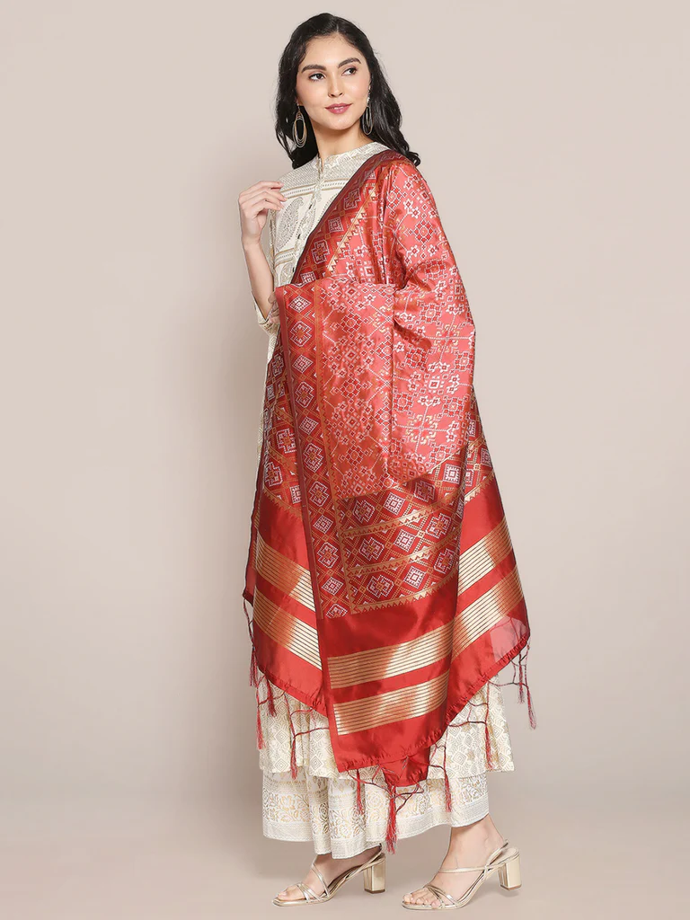 Add a touch of elegance to your wardrobe with this exquisite piece of beautiful Banarasi Silk Dupatta. Swathed with elegant Patola style weaving all over, this classic stunner is a must in your ethnic collection.